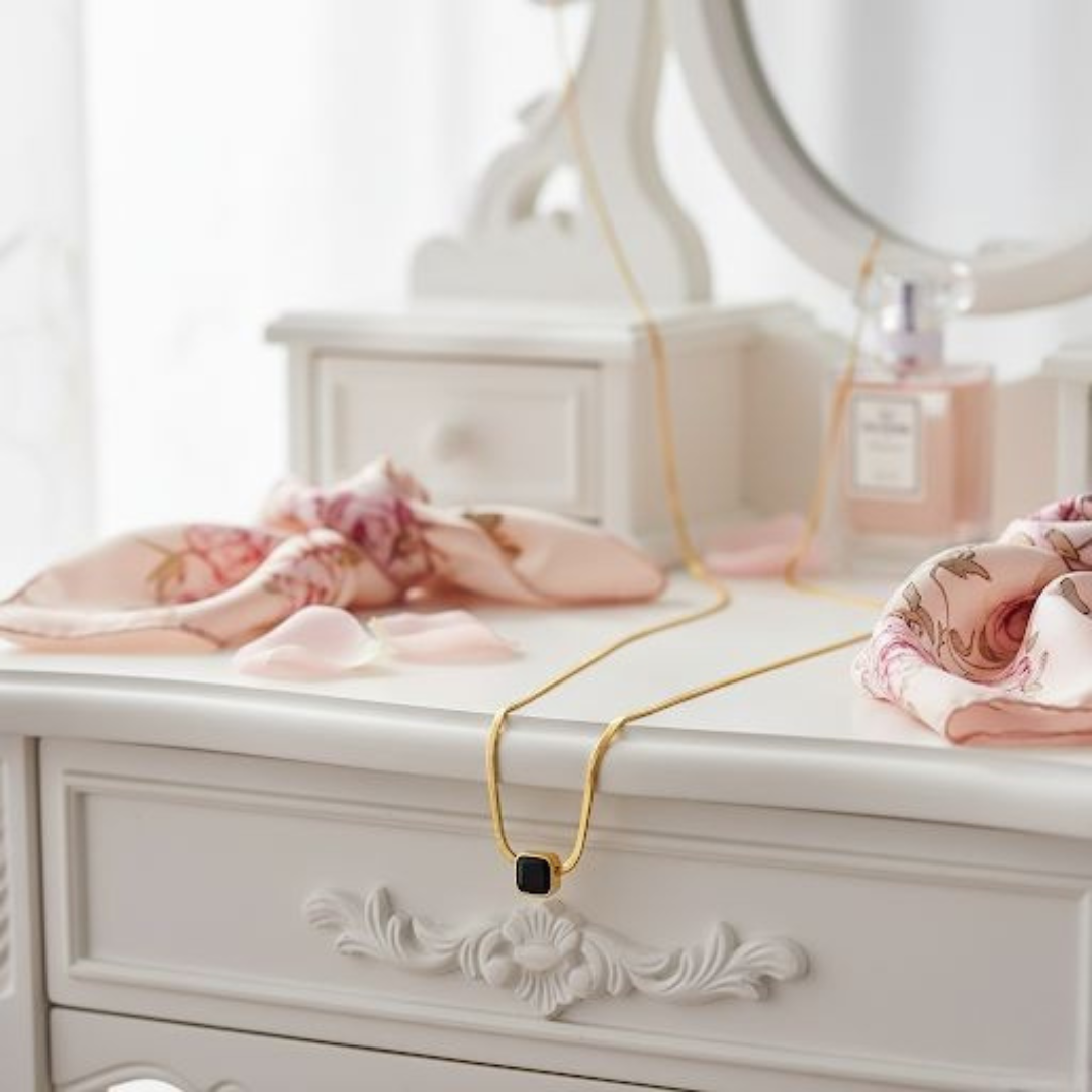 Embrace sleek, modern style with this chic Black Square Pendant Necklace. The design centers around a simple, striking black square charm, meticulously set in a polished gold-toned frame. Therefore, this necklace is the perfect foundational piece for any outfit, offering a bold contrast and a contemporary finish. The charm is paired with a smooth, luxurious Gold Plated Snake Chain Necklace known for its flat, liquid-like drape against the skin, giving it a high-end, finished look. This truly is the perfect Black Square Pendant Necklace for those who appreciate clean lines and sophisticated, minimalist jewelry.