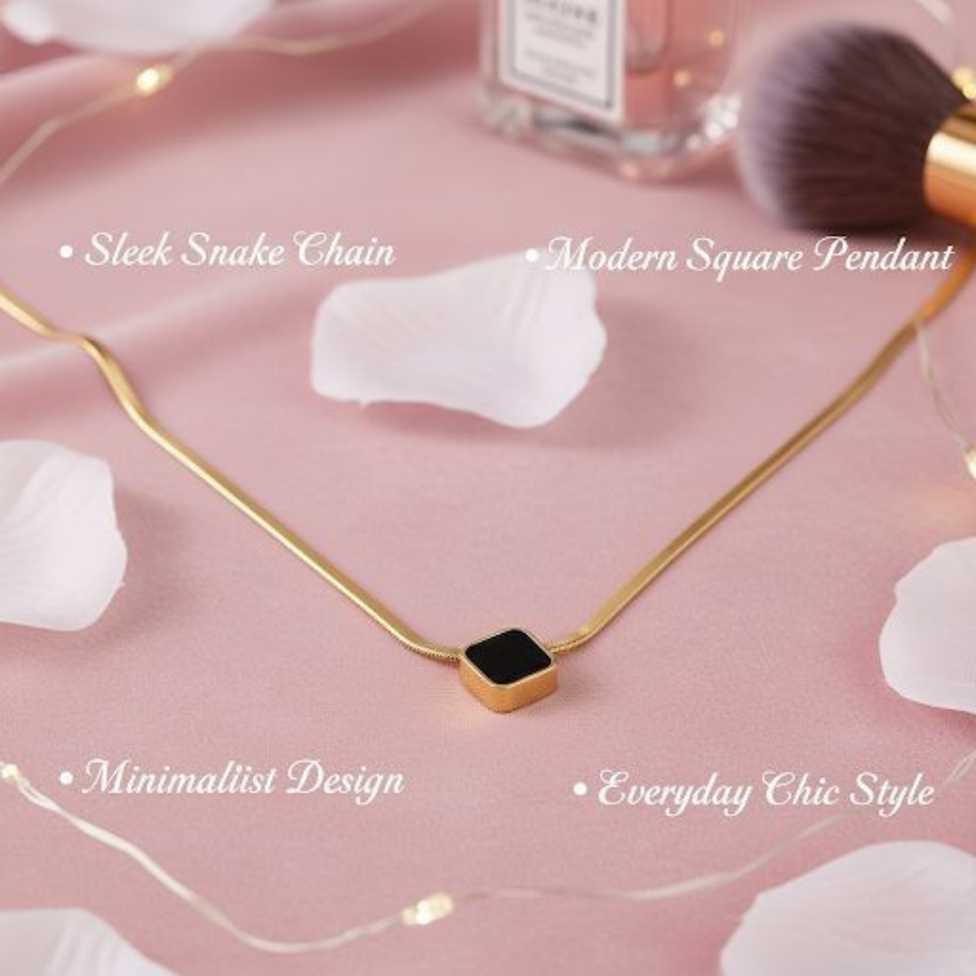 Elevate your style with this sleek Black Square Pendant Necklace. A Gold Plated Snake Chain Necklace with a Minimalist Gold Layering Necklace design. Features an Adjustable Chain and is Skin Friendly Imitation Jewellery, perfect for modern, everyday wear.
