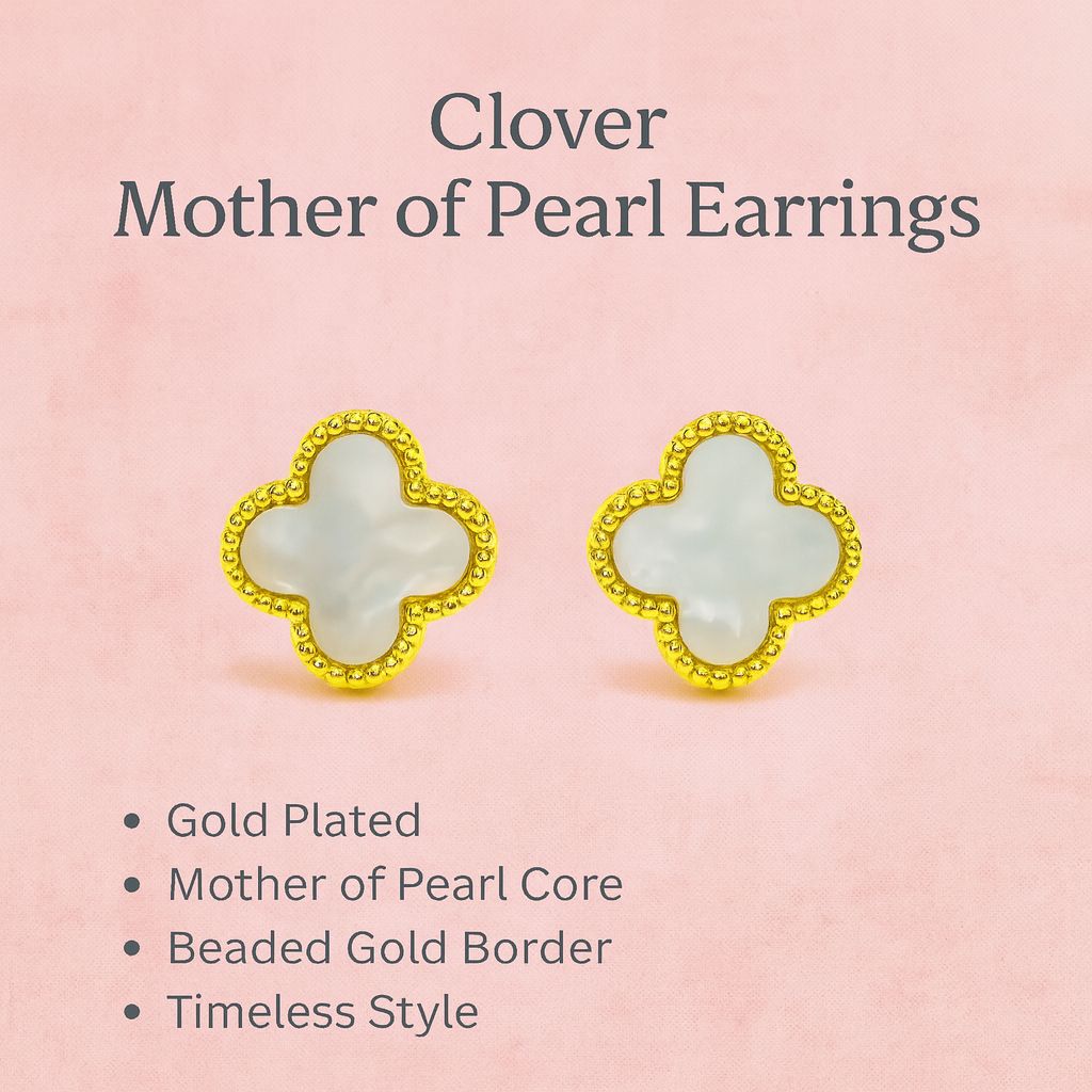 These classic Gold Plated Clover Stud Earrings feature a 1 cm mother-of-pearl style inlay and a delicate beaded edge. They are lightweight, skin-friendly, and boast a high-quality Korean design.