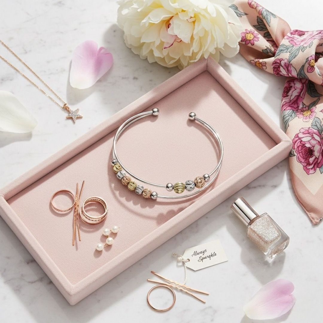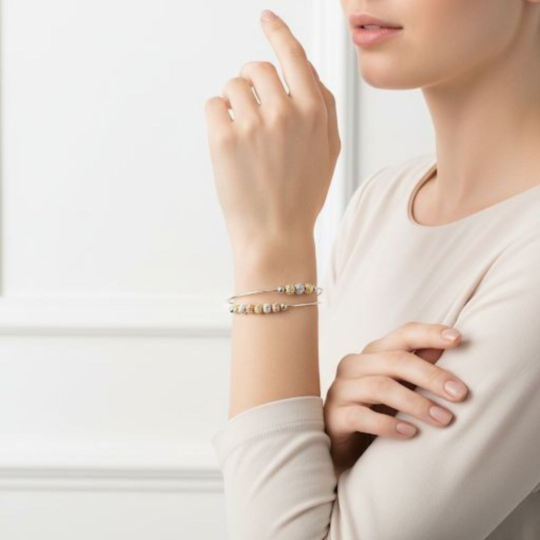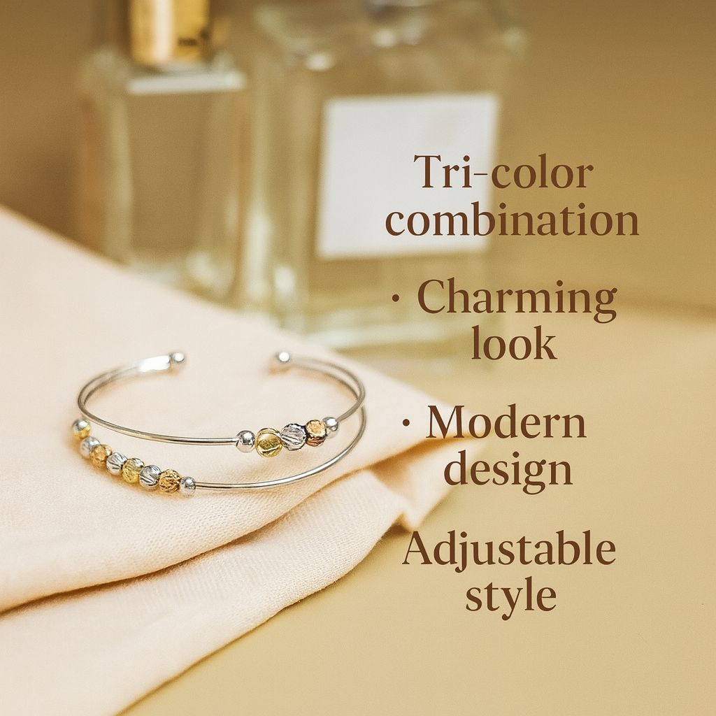 Achieve a subtle, sophisticated look with this Women’s Beaded Cuff Bangle. A Mixed Metal Double Band Bracelet featuring textured gold, silver, and rose-toned beads. This Lightweight Adjustable Bangle is Skin Friendly Imitation Jewellery, perfect for stylish, all-day comfort.”