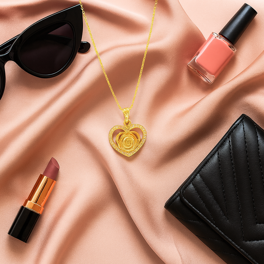 Express eternal love and delicate style with this charming Gold Plated Rose Heart Necklace, a truly sophisticated piece showcasing imported Korean design. This necklace is the ultimate embodiment of romance and natural beauty. The focal point is a unique pendant where a sculpted rose bloom sits perfectly within a heart-shaped frame. A dazzling halo of micro-pave Cubic Zirconia (CZ) stones encircles the heart, consequently providing brilliant sparkle and definition. The intricate floral and heart design, furthermore, creates a powerful symbol of affection and enduring grace.